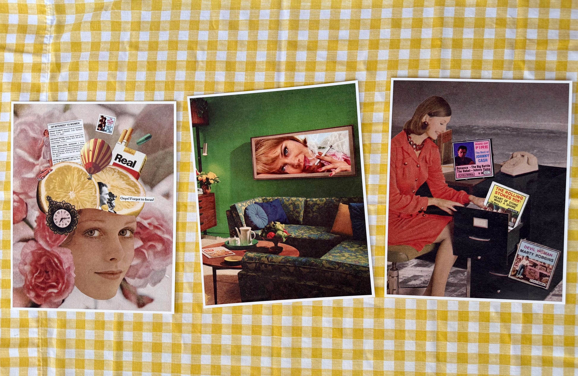 All collages are handmade, scanned, and printed by me. Scans are not digitally edited, so you may notice minor imperfections that are true to the vintage source material.